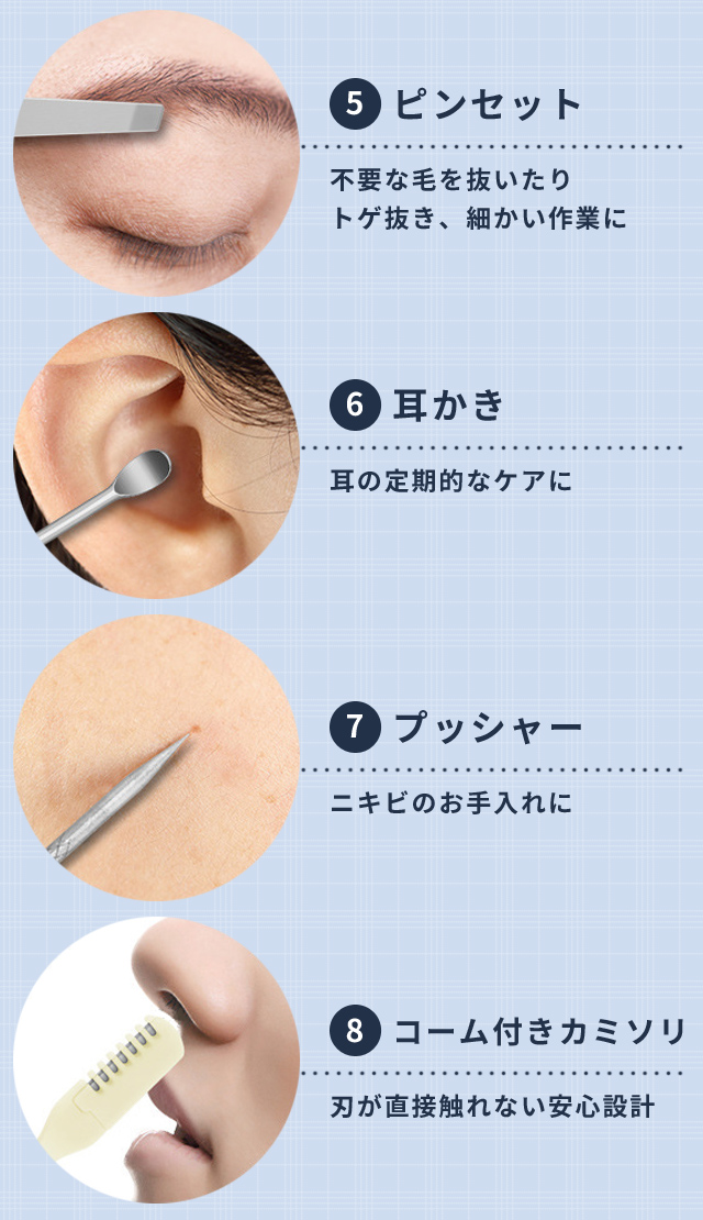 爪のケアはもちろん、耳かきやカミソリなどフェイスケアに便利なアイテムも入っています。