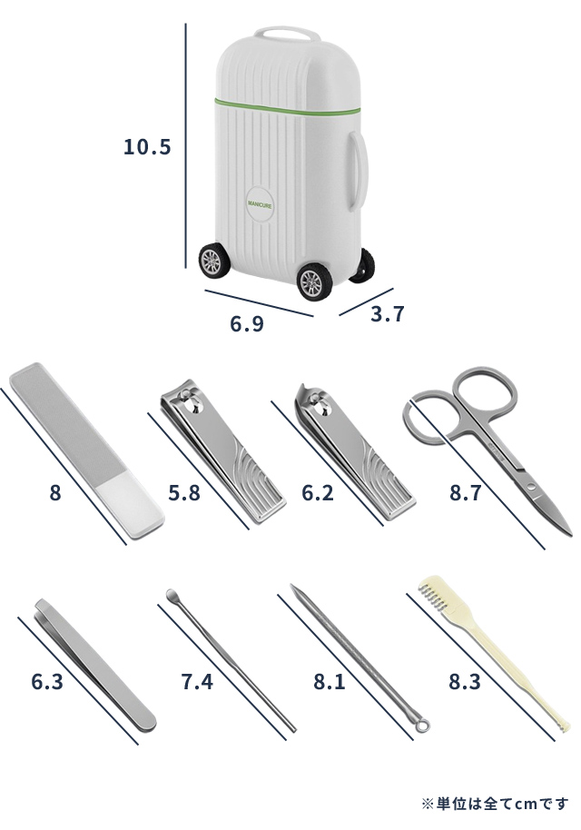 ツールサイズ(約):爪切り(湾曲)/5.8cm、爪切り(斜め)/6.2cm、ガラス爪やすり/8cm、眉はさみ/8.7cm、ピンセット/6.3cm、耳かき/7.4cm、プッシャー/8.1cm、コーム付きカミソリ/8.3cm