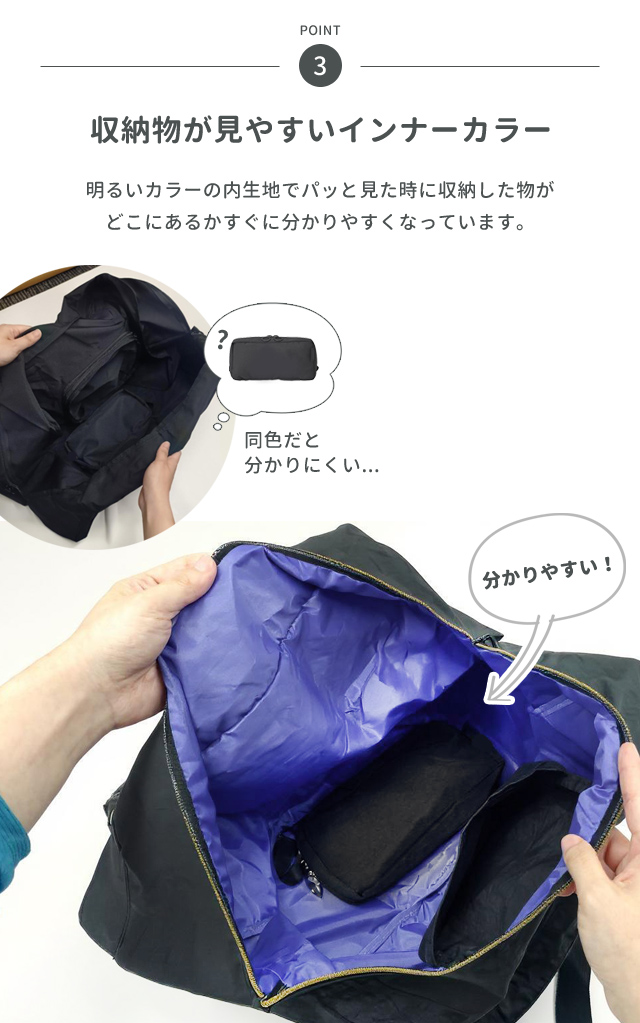 収納袋はバッグと一体型でなくす心配がなく、インナーポケットとして使えます。