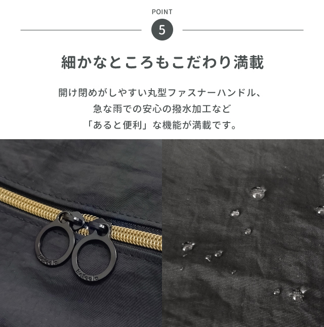 開け閉めがしやすい丸型ファスナーハンドル、急な雨でも安心の撥水加工など「あると便利」な機能が満載です。
