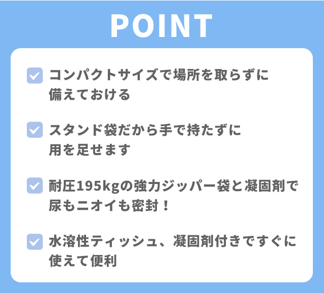 袋、凝固剤、ポケットティッシュがセットになっち得るのでもしもの時もすぐに使える!