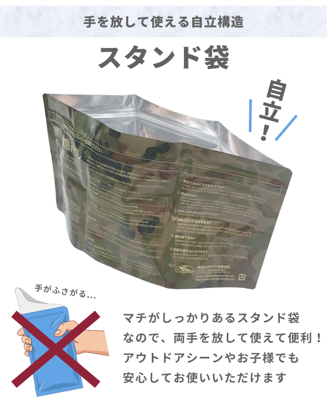 マチがしっかりあるスタンド袋なので、両手を放して使えて便利!アウトドアシーンやお子様でも安心してお使いいただけます。