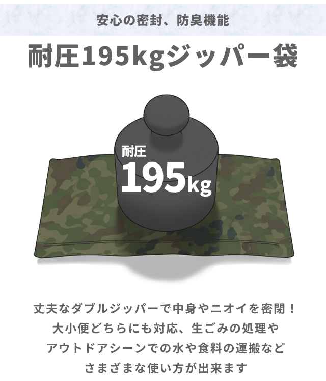 丈夫なダブルジッパーで中身やニオイを密閉!大小便どちらにも対応、生ごみの処理やアウトドアでの水や食料の運搬などさまざまな使い方が出来ます。