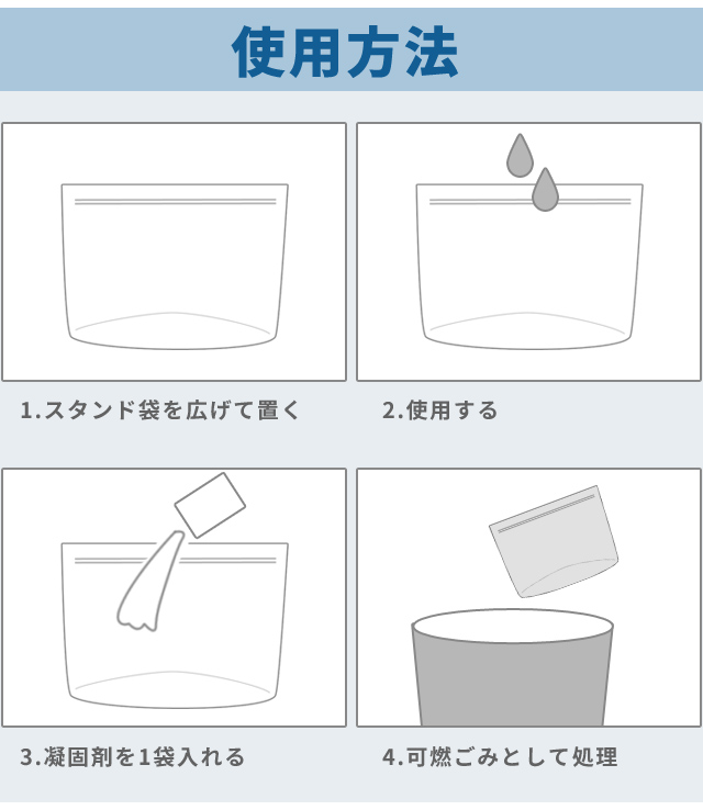 内容量:凝固剤(375ジェル)、スタンドチャック袋(2リットル)、水溶性ティッシュ