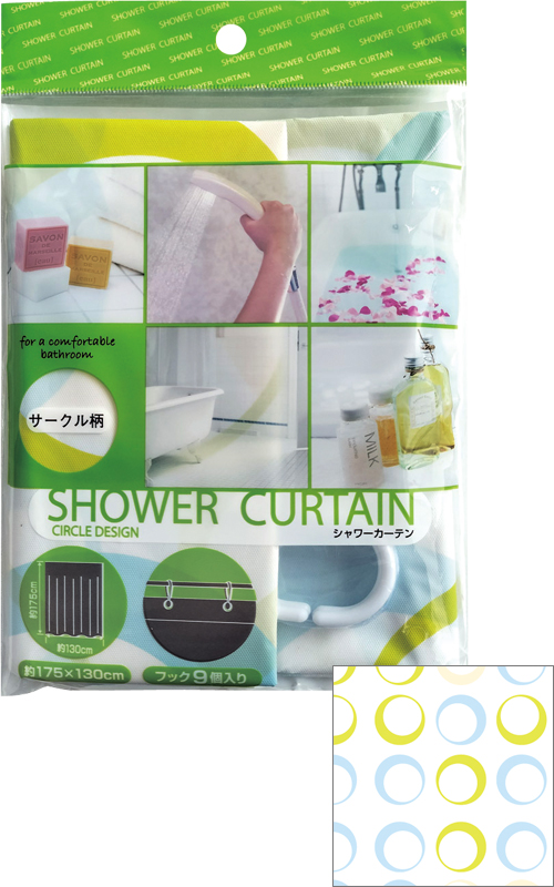 【まとめ買い=注文単位12個】サークル柄 シャワーカーテン175×130cm(フック9個入) アソート(色おまかせ) 43-124(se2a419)
