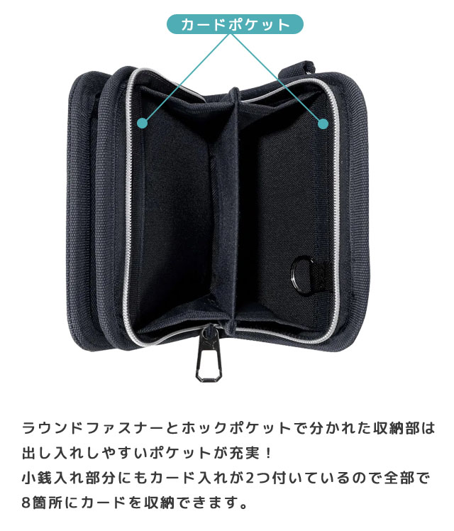 ラウンドファスナーとホックポケットで分かれた収納部は出し入れしやすいポケットが充実!