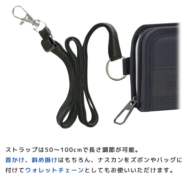 ストラップは50〜100cmで長さ調節が可能。首かけ、斜めがけはもちろん、ナスカンをズボンやバッグにつけてウォレットチェーンとしてもお使いいただけます。
