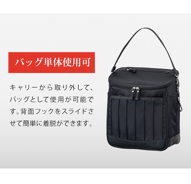 キャリーから取り外して、バッグとして使用が可能です。背面下部フックをスライドさせてバッグの着脱も簡単。