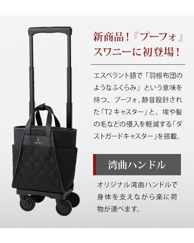 エスペラント語で「羽根布団のようなふくらみ」という意味を持つ、プーフォ。バッグの大胆なカッティングによりサイドポケットが広くなり、サイドポケットにペットボトルや折り畳み傘が入れやすいという機能的な面も持ち合わせています。新しい「スワニーモノグラムロゴ」はSWANYの5文字をロゴデザインに組み込んでおります。