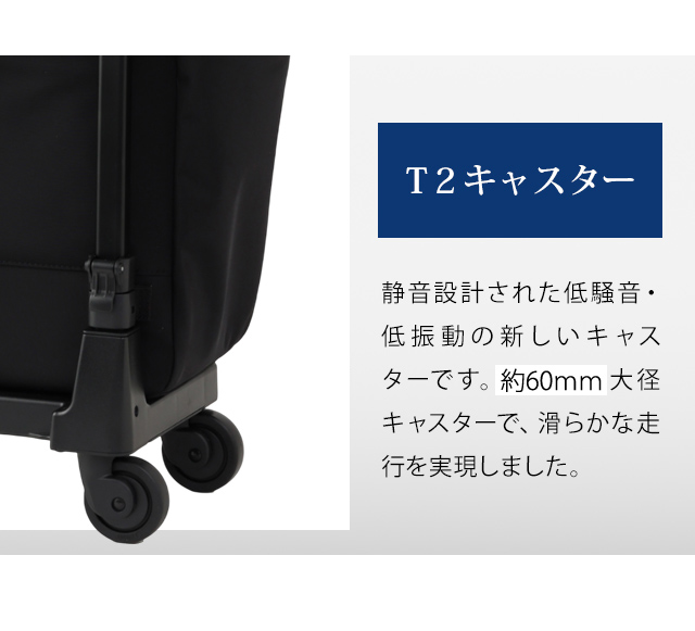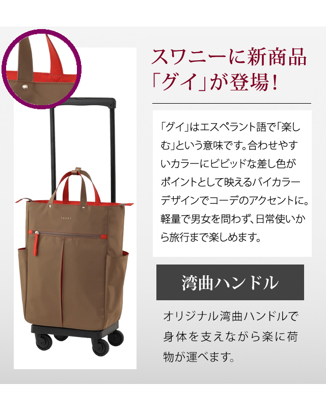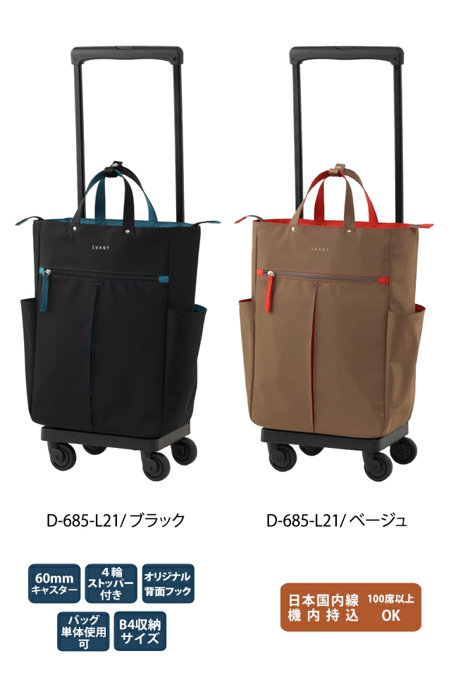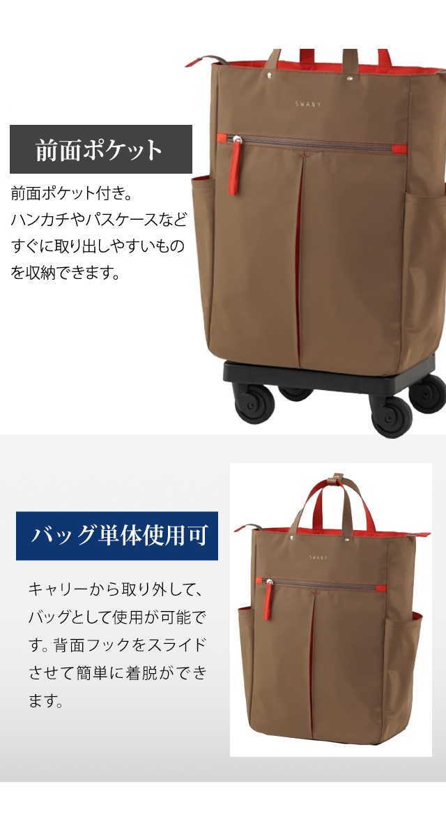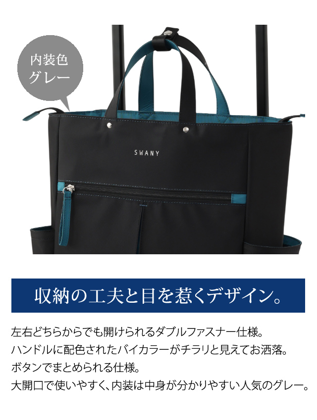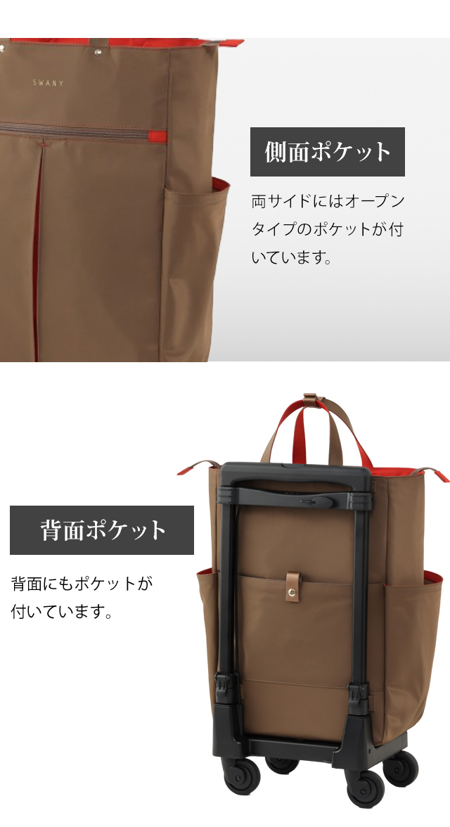 もちろん、スワニーバッグならではの4輪ストッパーやT2キャスターなどの便利な機能も充実しており、日常の様々なシーンで活躍します。