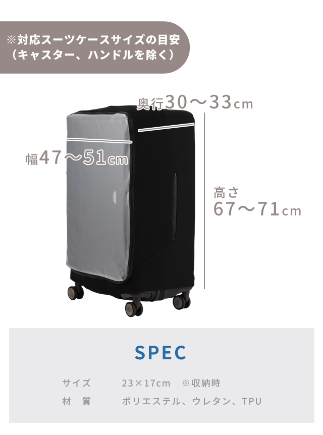 伸縮素材でぴったりフィットするフロントオープン用スーツケースカバーです。
