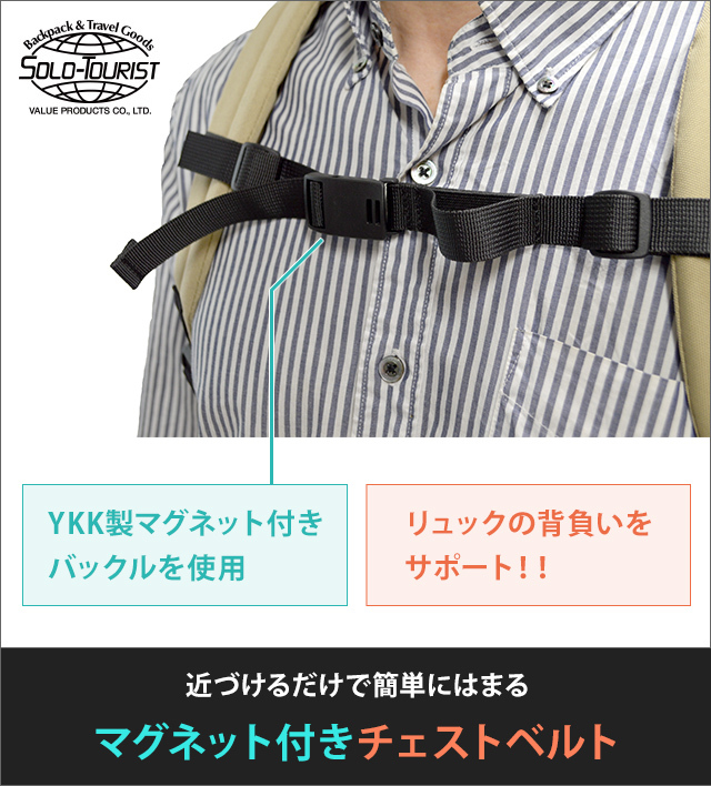 バックパッカーに人気の日本企画「ソロツーリスト」シリーズの大ヒット商品「チェストベルト」に、マグネット装着タイプが登場!