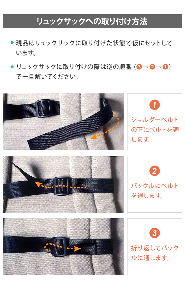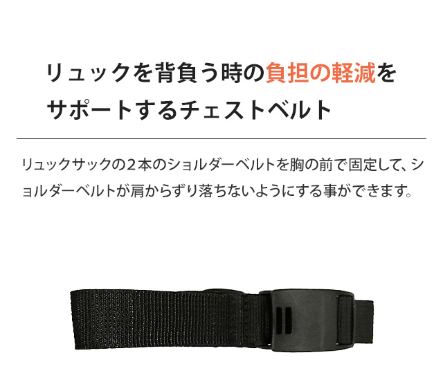 ・リュックサックの2本のショルダーベルトを胸の前で固定して、ショルダーベルトが肩からずり落ちないようにすることができます。