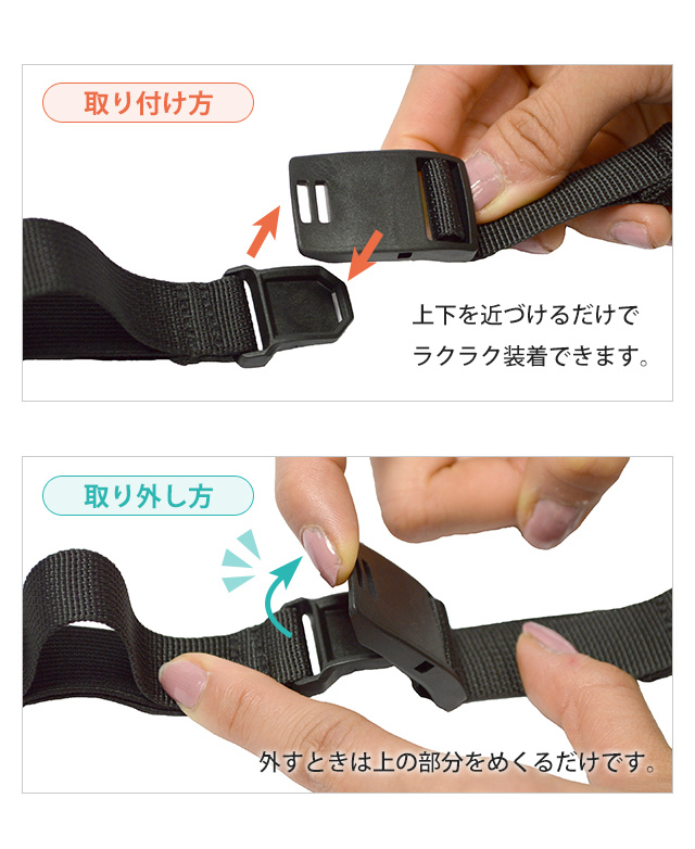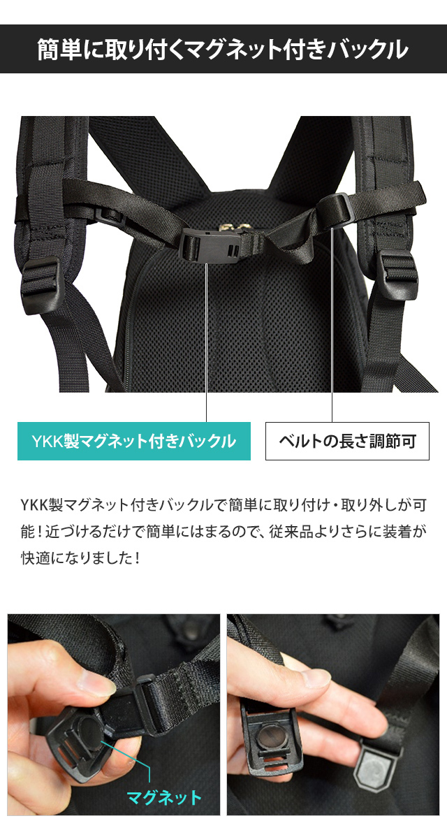 YKK製マグネット付きバックルで簡単に取り付け・取り外しが可能!