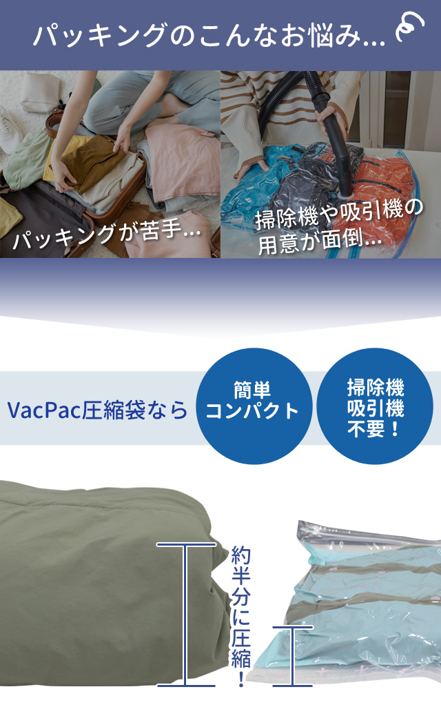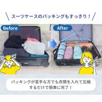 ★圧縮袋バックパック その他サイズ・セットは⇒【こちら!】衣類を入れてスライダーでチャックを閉め、丸めたり上から体重をかけるだけ!かさばる衣類を約1/2に圧縮!