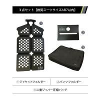 スーツを6分の1に折りたたむSU-PACK1/6*と、新開発の衣類をコンパクトに圧縮収納&両開き個別収納可能なセミハードボード入りαバッグ、回転させて収納できるパンツスクロールホルダーの3点セットです!