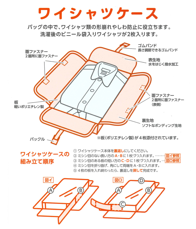 着脱可能な4本のプラスチックボードの挿入によって枠をつくり、ケースが立体的になりシワや型崩れ防止に役立ちます。