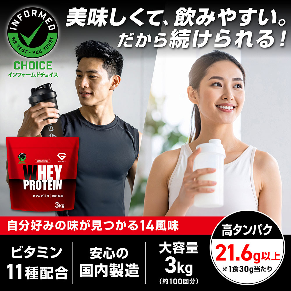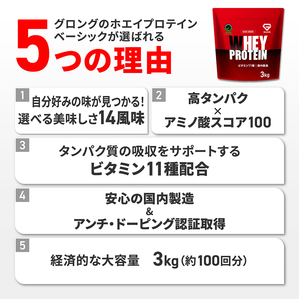 【ポイント5%+クーポン配布】グロング ホエイプロテイン100 風味付き 3kg 国内製造 タンパク質含有率72%以上 ベーシック GronG 爆買