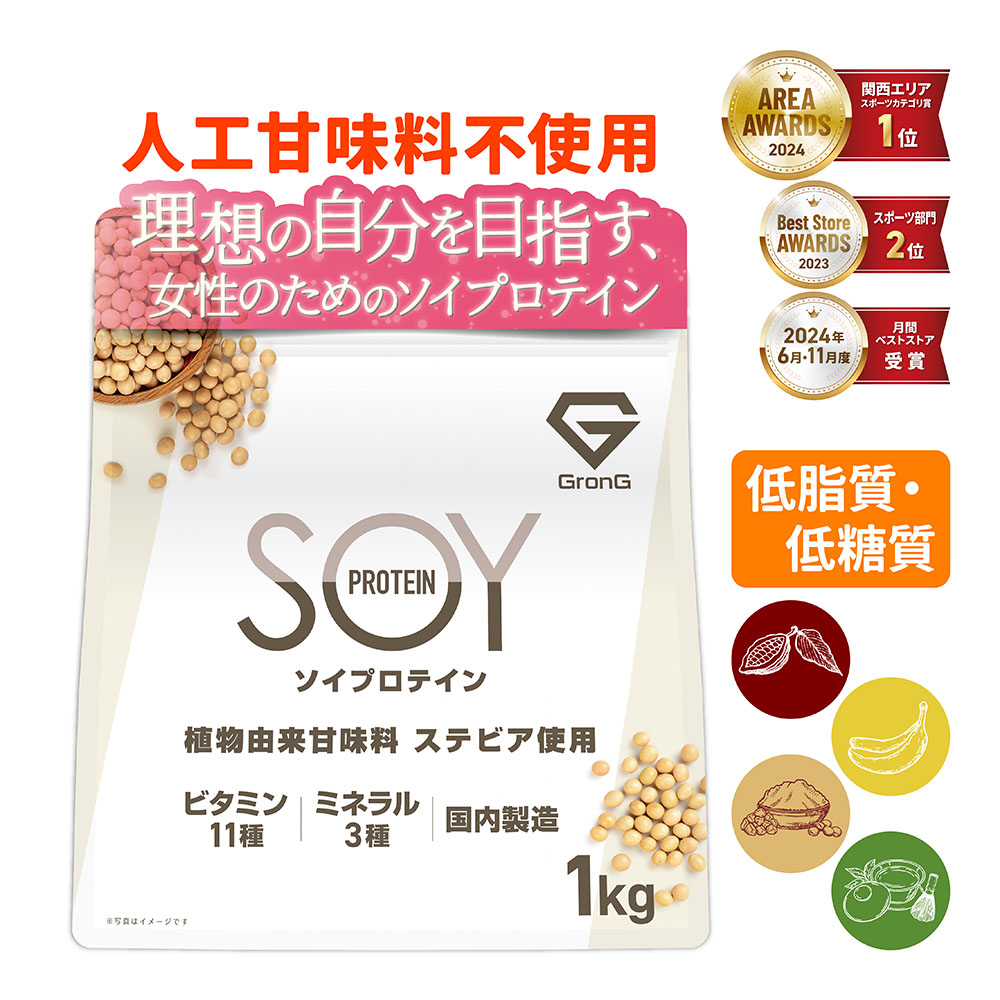 【先行配布中★10%オフクーポン】ソイプロテイン 大豆プロテイン 植物由来甘味料 ステビア使用 ビタミン11種 ミネラル3種 1kg GronG 爆買