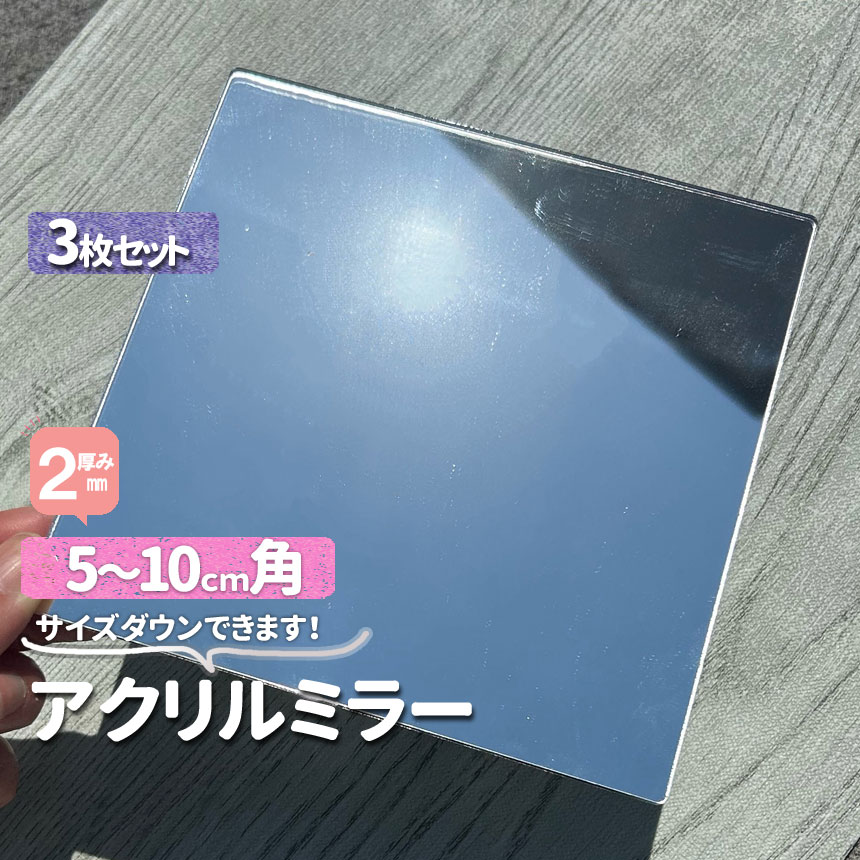 アクリル板 シルバーミラー厚2mm 四角正方形3枚セット 50/60/70/80/90/100mm サイズダウン1ミリ単位オーダーカット 加工 角丸 樹脂板材 カガミ鏡