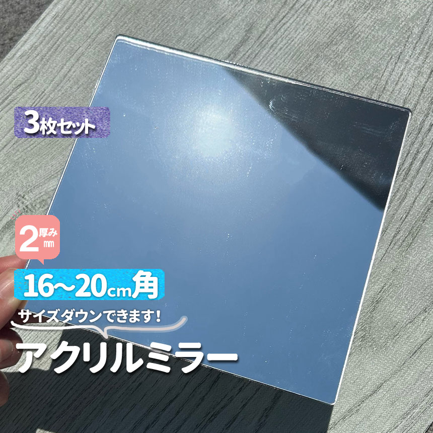 アクリル板 シルバーミラー厚2mm 四角正方形3枚セット 160/170/180/190/200mm サイズダウン1ミリ単位オーダーカット 加工 角丸 樹脂板材 カガミ鏡