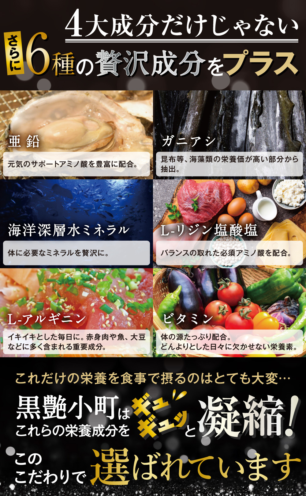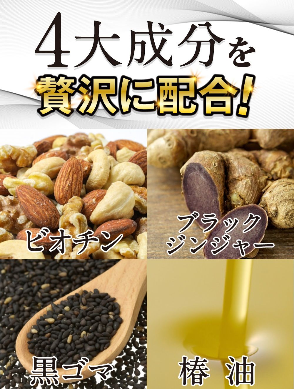 | 原材料 | サフラワー油(国内製造)、大豆ペプチド、黒ごまペースト、ブラックジンジャーエキス末、亜鉛酵母、ガニアシ末、ツバキ種子エキス末、海洋深層水末/ゼラチン、グリセリン、L-リジン塩酸塩、グリセリン脂肪酸エステル、ミツロウ、L-アルギニン、カラメル色素、V.C、ナイアシン、V.E、バントテン酸Ca、ビオチン、V.B6、V.B1、V.B2 、V.A、V.D、葉酸、(一部に大豆、ごま、ゼラチンを含む) |