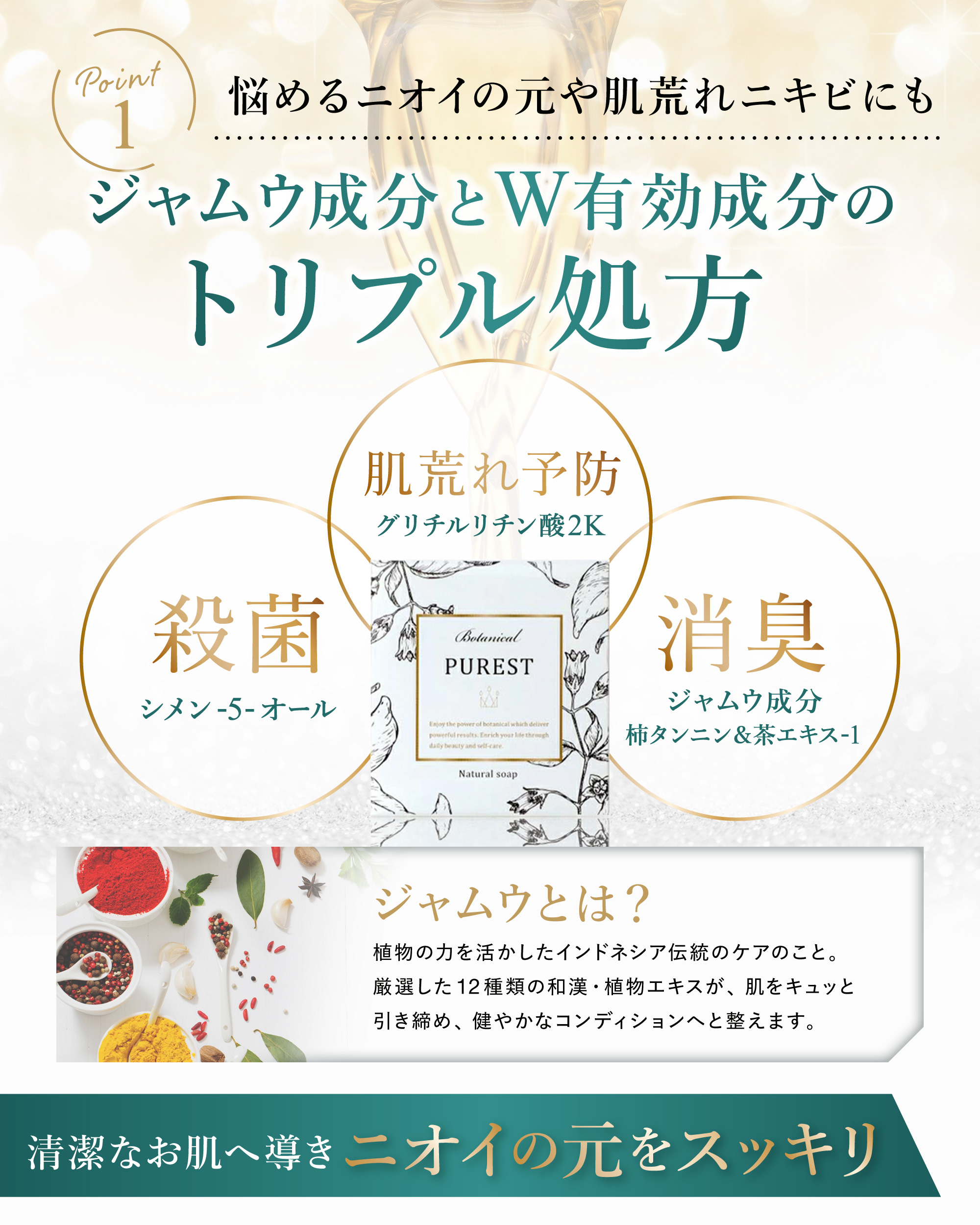 | 原材料 | 有効成分: グリチルリチン酸2K、シメン-5-オール その他の成分:石けん用素地、DPG、PEG(80)、EDTA-4Na、ヒドロキシエタンジホスホン酸液、ヒドロキシエタンジホスホン酸4Na液、柿タンニン、BG、茶エキス-1、ワレモコウエキス、エイジツエキス、シャクヤクエキス、オウバクエキス、トレハロース、アロエエキス-2、サクラ葉抽出液、香料 |