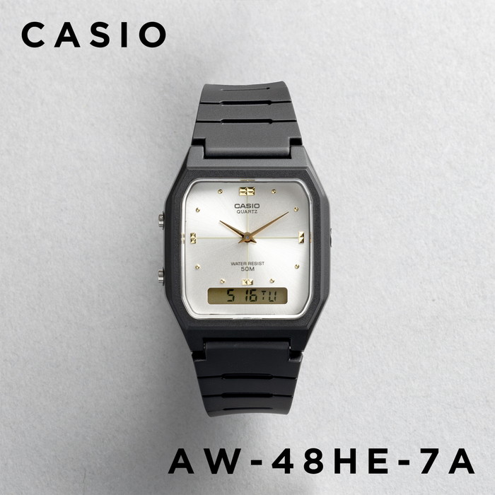カシオAW-48は、ミニマルデザインのアナデジウォッチです。視認性を重視したAW-48Hと、アクセサリー要素が色濃いAW-48HEで商品展開されています。AW-48Hは針が太く、時刻が読み取りやすいのが特徴です。文字盤カラーは、オーソドックスな白黒のつや消しで、外周にドットインデックス(目盛り)とアラビア数字が配置されています。AW-48HEは、アクセサリー感覚で使える、ブラック&ゴールドのコンビネーションカラーが特徴です。文字盤は光を放射状に反射して、見る角度によって様々な表情に変化します。キラッと輝くゴールドの針と、スタッズ状のインデックスもアクセサリー感を高めています。 | |