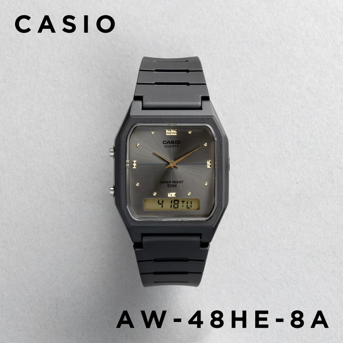 カシオAW-48は、ミニマルデザインのアナデジウォッチです。視認性を重視したAW-48Hと、アクセサリー要素が色濃いAW-48HEで商品展開されています。AW-48Hは針が太く、時刻が読み取りやすいのが特徴です。文字盤カラーは、オーソドックスな白黒のつや消しで、外周にドットインデックス(目盛り)とアラビア数字が配置されています。AW-48HEは、アクセサリー感覚で使える、ブラック&ゴールドのコンビネーションカラーが特徴です。文字盤は光を放射状に反射して、見る角度によって様々な表情に変化します。キラッと輝くゴールドの針と、スタッズ状のインデックスもアクセサリー感を高めています。 | |