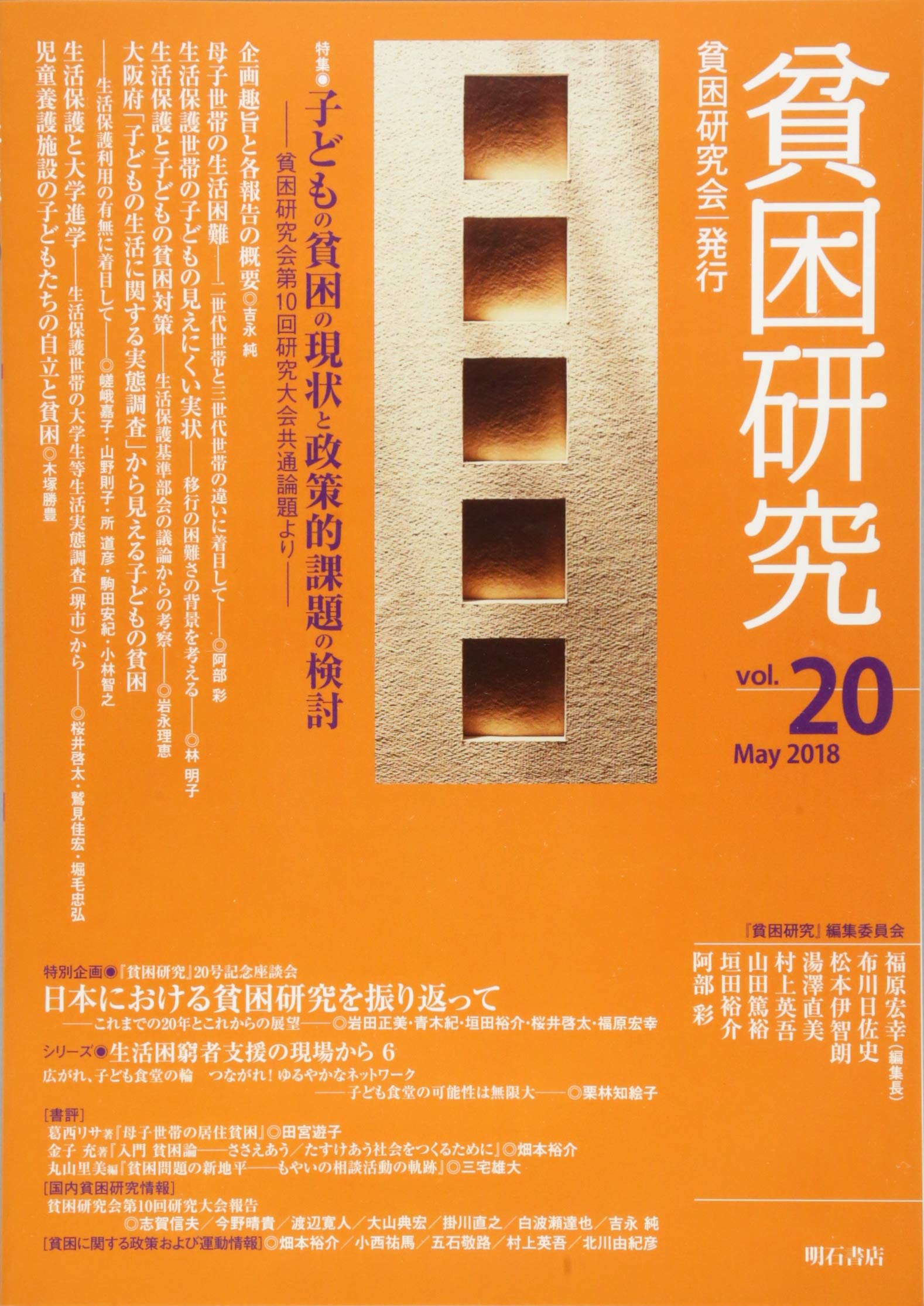 日本における貧困研究の深化・発展、国内外の研究者の交流をはかり、貧困問題をさまざまな人々に伝えていく、日本初の貧困研究専門誌・20号。特集「子どもの貧困の現状と政策的課題の検討」に加え、研究者たちが貧困研究の10年を総括し今後の課題を探る。