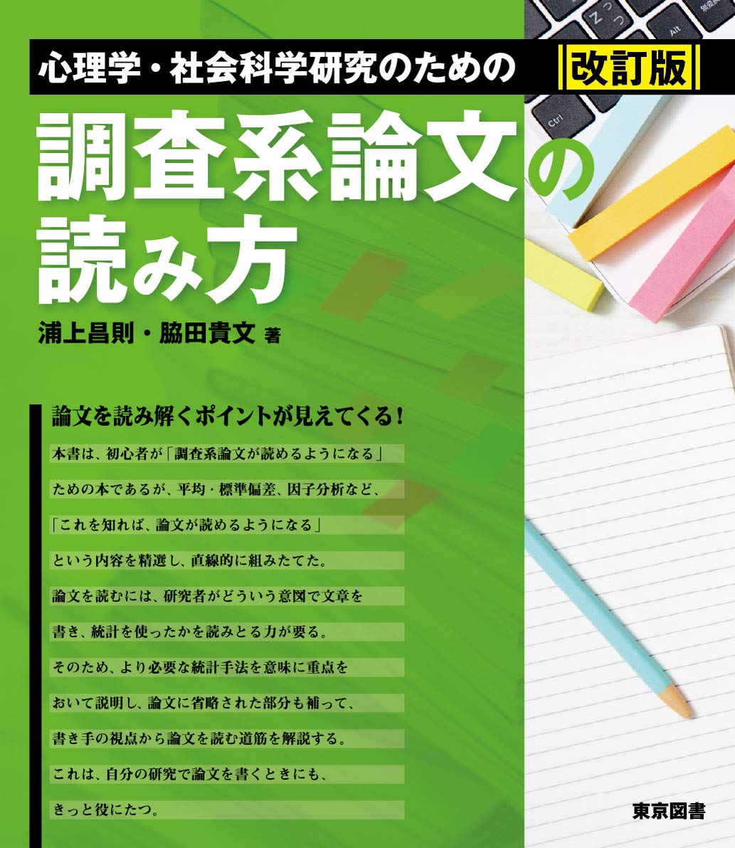 論文を読むには、研究者がどのような意図でその文書を書き、 その分析手法を使ったかを読み取る力が必要になる。 「統計を使った論文が読めるようになる」ことを目的とした本書は、 その手法が使われた理由と結果の意味が理解できるよう解説のポイントを厳選。 論文には決して書かれることのない部分を補いつつ、 書き手の視点から論文を読む筋道を解説する。 改訂版では効果量や95%信頼区間などについての記述を追加し、 近年の情勢により合わせた構成となっている。もくじ 第0章 「論文を読む」ということ 第1章 論文とは何なのか? 第2章 研究における測定 第3章 測定から統計へ 第4章 探索的因子分析 第5章 確定的因子分析・t 検定 第6章 1 要因分散分析・相関係数・偏相関係数 第7章 2 要因分散分析・χ2 検定 第8章 重回帰分析 第9章 共分散構造分析