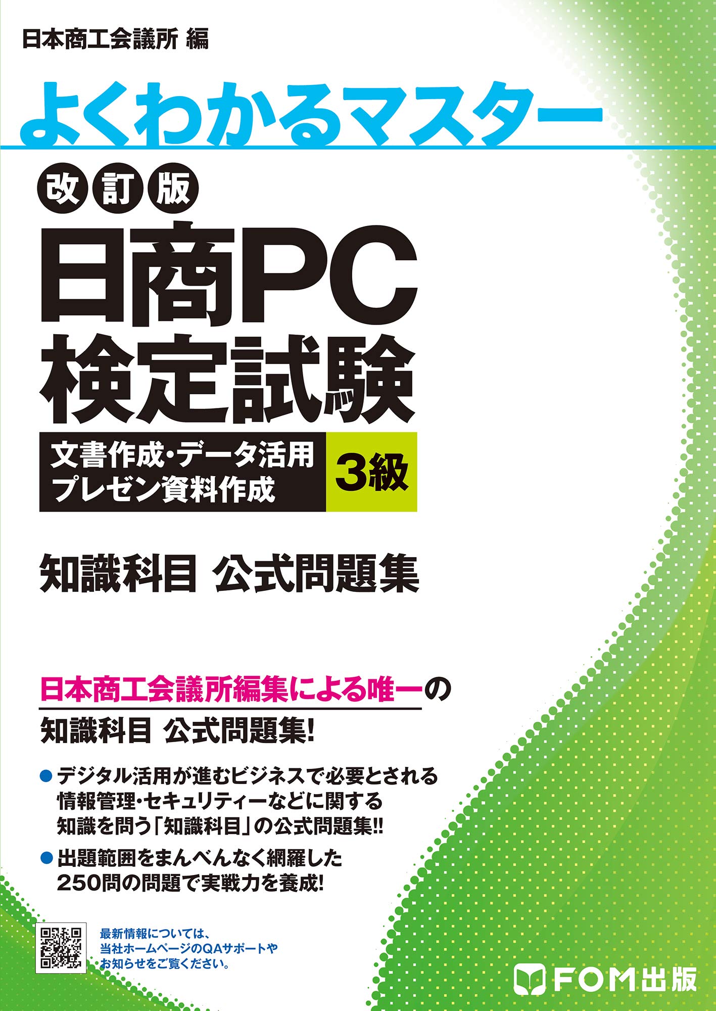 日商PC検定試験の学習で、意外と苦労するのが「知識科目」。出題範囲が広く、幅広い知識が必要とされるため、どのように攻略したらいいのかわからない、という受験者の声がよく聞かれます。そんな受験者のために用意されたのが、この「3級 知識科目 公式問題集」です。出題範囲をまんべんなく網羅した豊富な問題、そして詳しい解説を通して、効率よく知識を底上げできます。◆唯一の知識科目の公式問題集!試験主催元である日本商工会議所の執筆による公式問題集です。本試験に準じた予想問題から構成されており、出題傾向や出題形式を学ぶのに最適です。◆文書作成、データ活用、プレゼン資料作成の3分野をカバー!一冊で「文書作成 3級」「データ活用 3級」「プレゼン資料作成 3級」の3分野に対応しています。◆厳選された全250問を収録!共通分野 100問、文書作成分野 50問、データ活用分野 50問、プレゼン資料作成分野 50問を収録しています。出題範囲をまんべんなく網羅した250問を徹底的に学習すれば、知識科目対策は万全です。◆的確な解説で弱点補強に最適!250問の各問題について、丁寧な解説を掲載しています。弱点を補強し、応用力を伸ばすのに最適です。また、「解答と解説」は切り離し可能な別冊で提供します。