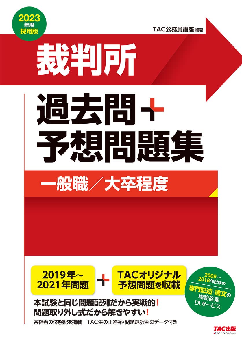 【本試験問題+予想問題で第1志望に向けた直前対策を強力サポート! 】 公務員試験の受験対策にはある程度長い期間が必要ですが、 学習の後半においては、これまで科目ごとに得点力を高める学習をしていた段階から、 科目横断的に、より本番に即した学習を意識すべき段階に移行します。 この時期に重要なのは、大きく次の2点です。 (1)本試験での時間配分をあらかじめ体験して備えておくこと (2)残りの期間で得点を伸ばせる分野、これ以上の底上げが期待しづらい分野を冷静に見極めること この問題集では、裁判所(一般職/大卒程度)採用試験について、 過去3年分の過去問を試験の実施順序のとおりに掲載し、詳細な解説を設けています。 これを使えば、時間を計って取り組むことで本試験の時間感覚をあらかじめ体得できますし、 出題分野にひと通り取り組むことで、残りの時間を何に優先的に費やすかを決めるための目安とすることもできるでしょう。 【本書の特長】 ★特長・1 過去問に加えてTACオリジナル予想問題を収録! 本書では、本試験で出題された過去問に加え、新たにTAC公務員講座が創作したオリジナル問題を1セット収録しました。 過去問の中には、科目別の学習の中で取り組んだことのある問題(初見ではない問題)も含まれていることでしょう。 でも予想問題は全問初見で取り組むことができ、真に実力を試すいい材料となります。 最後の仕上げにぜひチャレンジしてみてください。 ※TACオリジナル予想問題は、2021年に実施されたTAC公務員講座の公開模試をベースに、 修正を加えたものを掲載しています。 ★特長・2 TAC生の受験時のデータを公開! 全国のTAC生が実際の試験で解答した内容についての報告をもとに、択一試験について 「TAC生の正答率」および「TAC生の選択率」を掲載しています。 これを見ると、正答率の高い問題なら本試験でも必ず得点すべき基本問題だとわかりますし、 正答率が低い問題ならあまり対策に時間を費やすべき分野ではないというヒントも得られるかもしれません。 ★特長・3 TAC生の合格体験記を収録! この試験に合格したTAC出身の合格者に取材し、合格体験記を掲載しています。 志望のきっかけや学習のアドバイス、苦手科目の克服法や本番当日を迎えるにあたっての注意点など、 志望者の気になる情報が最新の受験経験を踏まえて語られていますので、ぜひご活用ください。 ★特長・4 「抜き取り式」で取り組みやすい! 本書は問題部分を取り外すことができます。 時間を計って取り組むときは解きやすく、答え合わせの際も復習しやすい構造となっています。 ★特長・5 【購入者特典】過去の記述試験の模範解答をDL可能! 本書の購入者特典として、2009~2018年の記述試験の問題・模範答案をWeb上でDLできます。 記述試験は多くの合格答案に触れるのが合格への近道ですから、ぜひご利用ください。