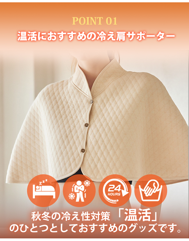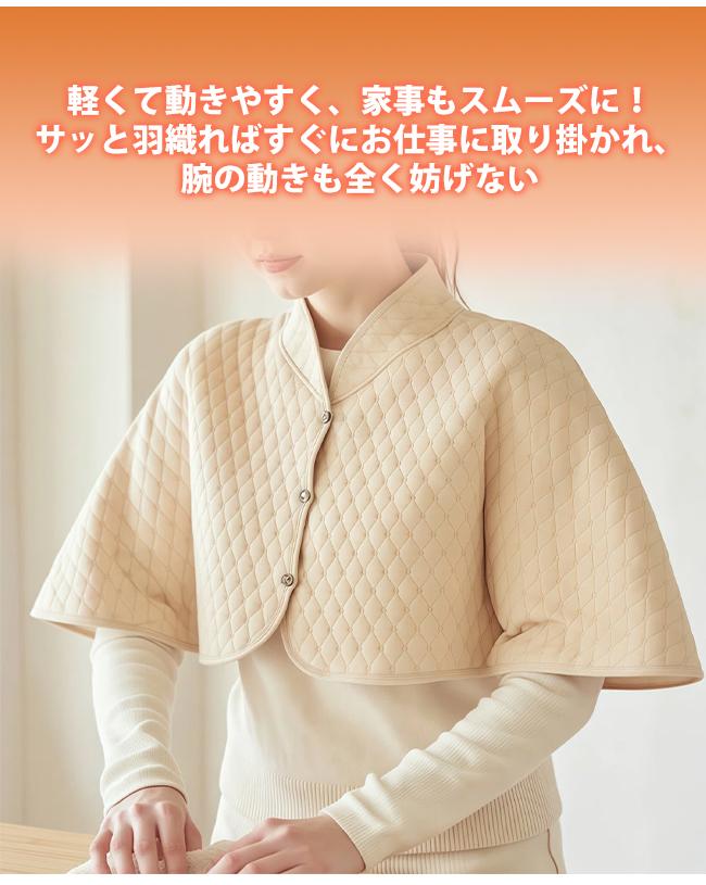 冷えやすい肩先を柔らかく包み込み、ずっとあったかさをキープ