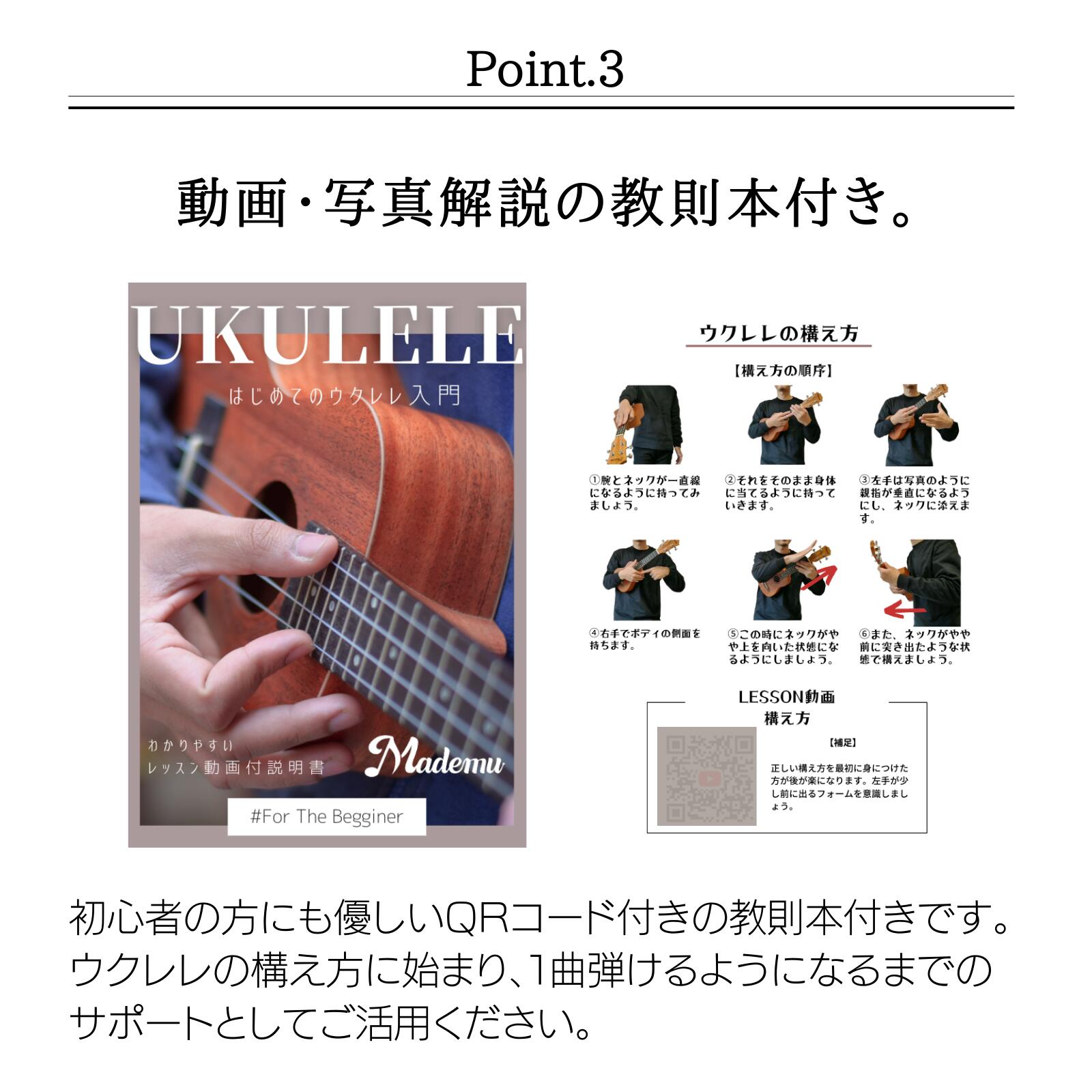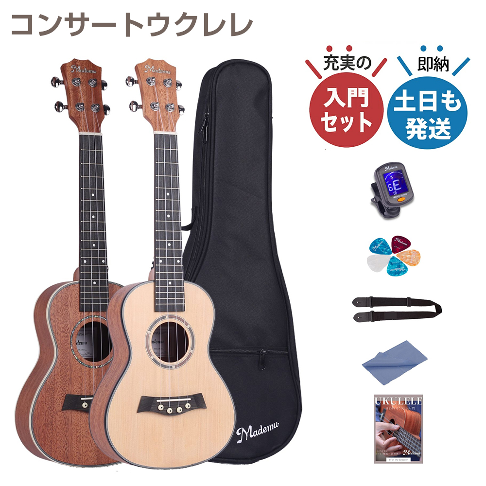 セット内容:Mademu マデム コンサートウクレレ本体・バッグ・ストラップ・チューナー・クロス・ピック・初心者教則本