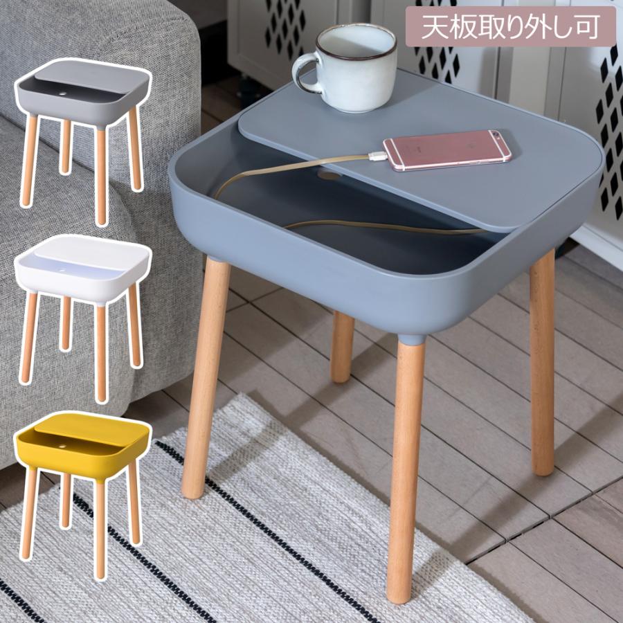 テーブル天板は取り外し可能。またコードを通す穴が開いていますので、スマホの充電ケーブルなどにもすっきりと使えます。