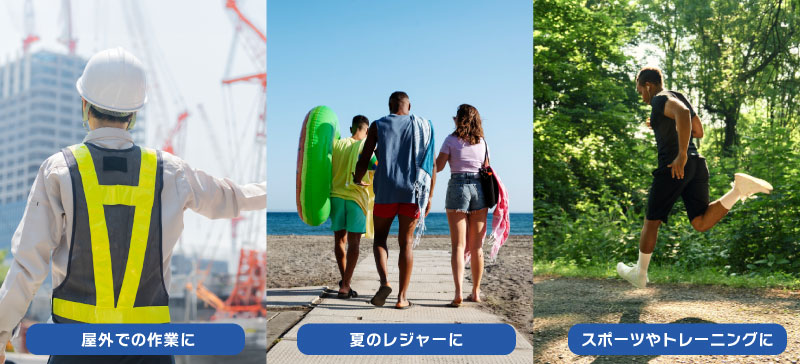 屋外作業・スポーツ・夏のレジャーまで、あらゆるシーンで活躍します。