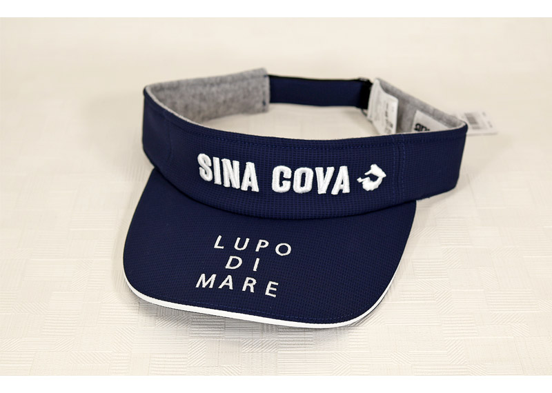 SINACOVA文字ロゴとLUPO DI MARE (海の狼=シナコバキャプテン)の刺繍をデザインしたサンバイザーです