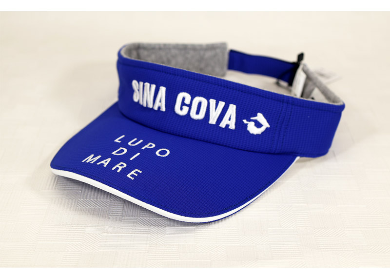 SINACOVA文字ロゴとLUPO DI MARE (海の狼=シナコバキャプテン)の刺繍をデザインしたサンバイザーです