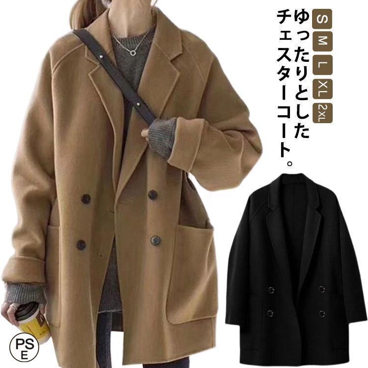 チェスターコート レディース ミディアム丈 ダブルボタン ラグラン袖 長袖 ゆったり メルトン 春秋 アウター 暖かい きれいめ 無地 ミドル丈