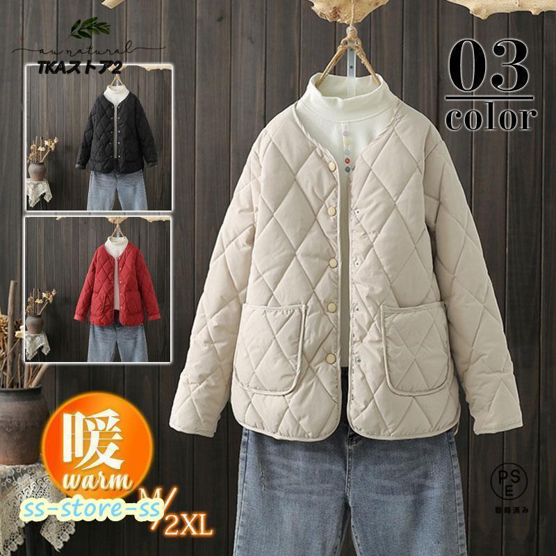 キルティングコート レディース 中綿コート 襟なし ショート丈 長袖 キルティング 無地 軽量 大きいサイズ 暖かい アウター かわいい ゆったり