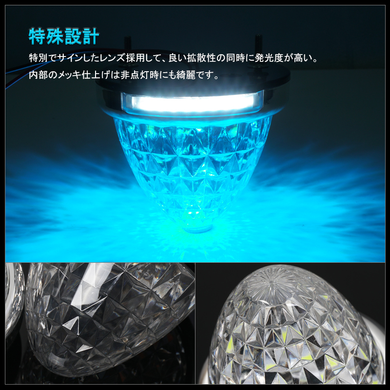 特殊設計 特別でサインしたレンズ採用して、良い拡散性の同時に発光度が高い。 内部のメッキ仕上げは非点灯時にも綺麗です。