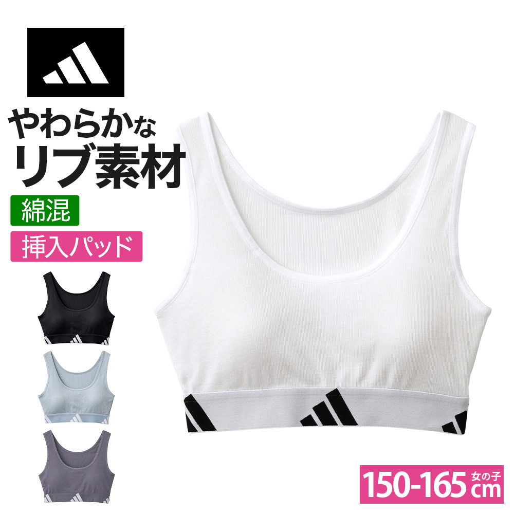 グンゼ/GUNZE/adidas/アディダス/キッズ/ジュニア/子供/学校生活/パッド取り外し可/デイリー/日常/快適な着心地/吸汗速乾/スポーツ/レディース/ハーフトップ/パッド入り/スポーツブラジャー/スポブラ/ホワイト/白/ブラック/黒/サックス/水色/APE530EC/APE5375/APE5380/APE5385/150cm/160cm/165cm