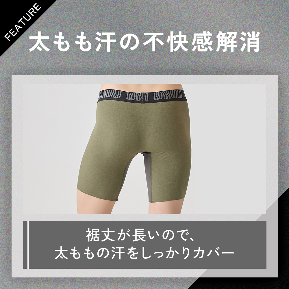 裾丈長めのロングタイプで、太もも周りの汗を素早く吸収し、蒸発させる素材を使用。