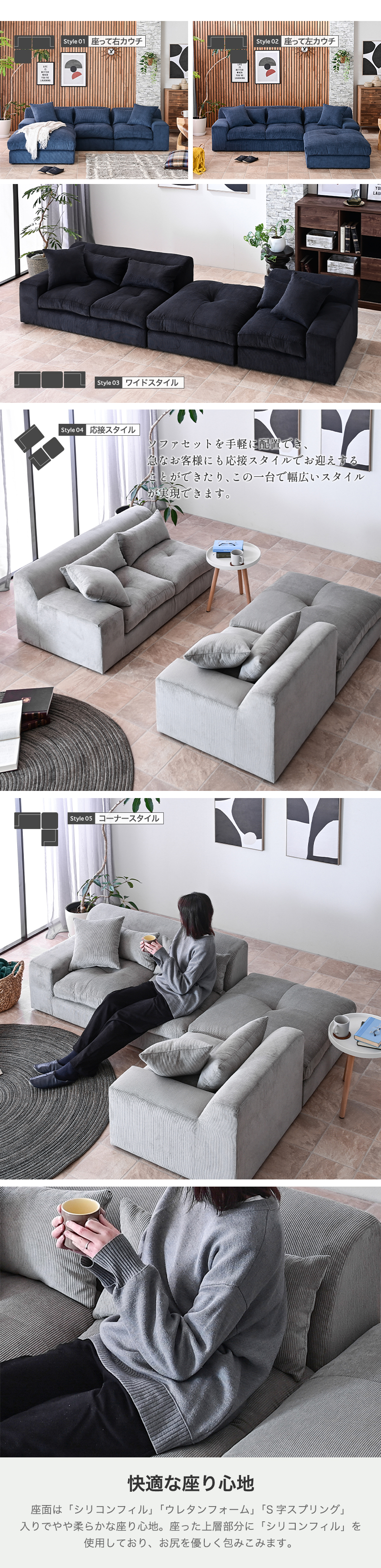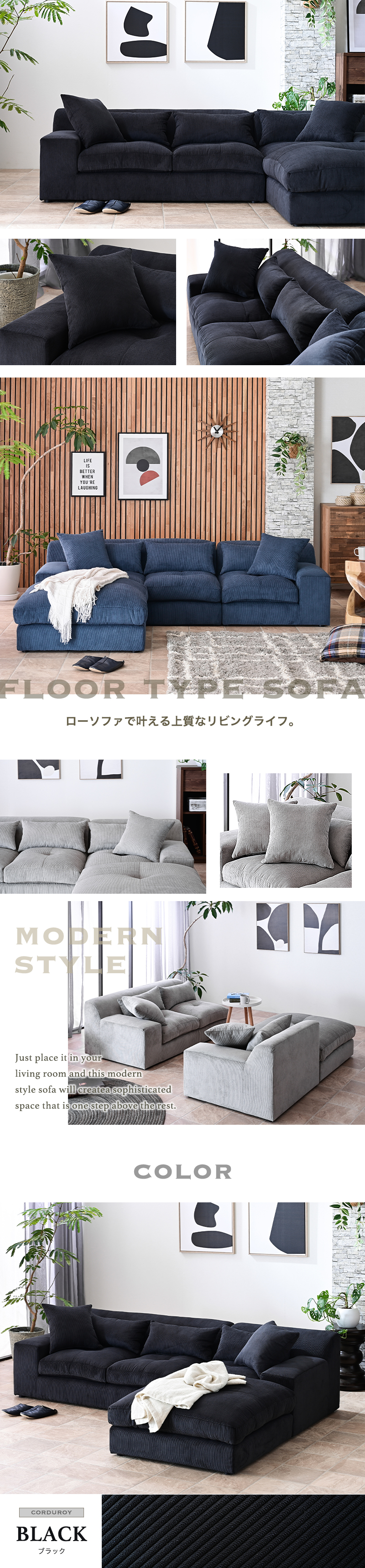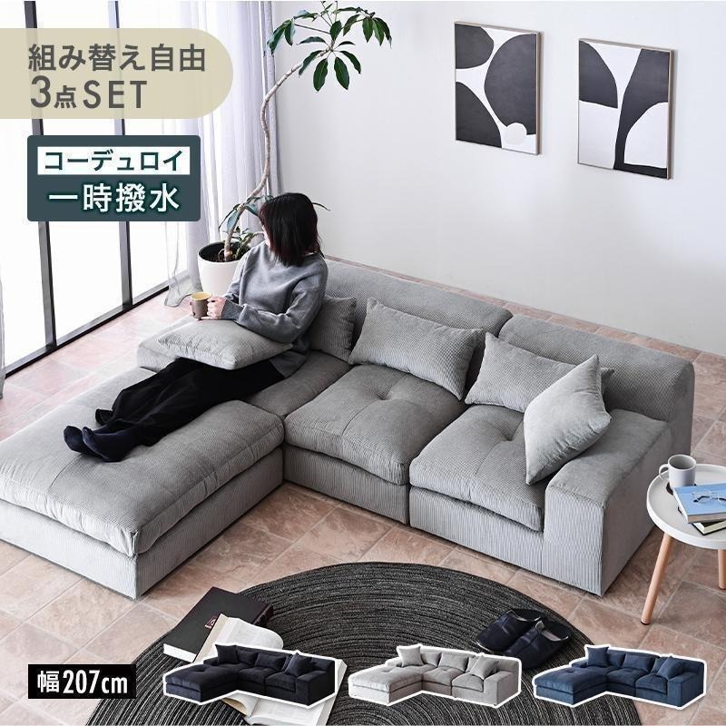 幅207cm コーデュロイ カウチ ソファ 3人掛け ソファー カウチソファ カウチソファー ロータイプ 3P ローソファ ファブリック L字 コーナー