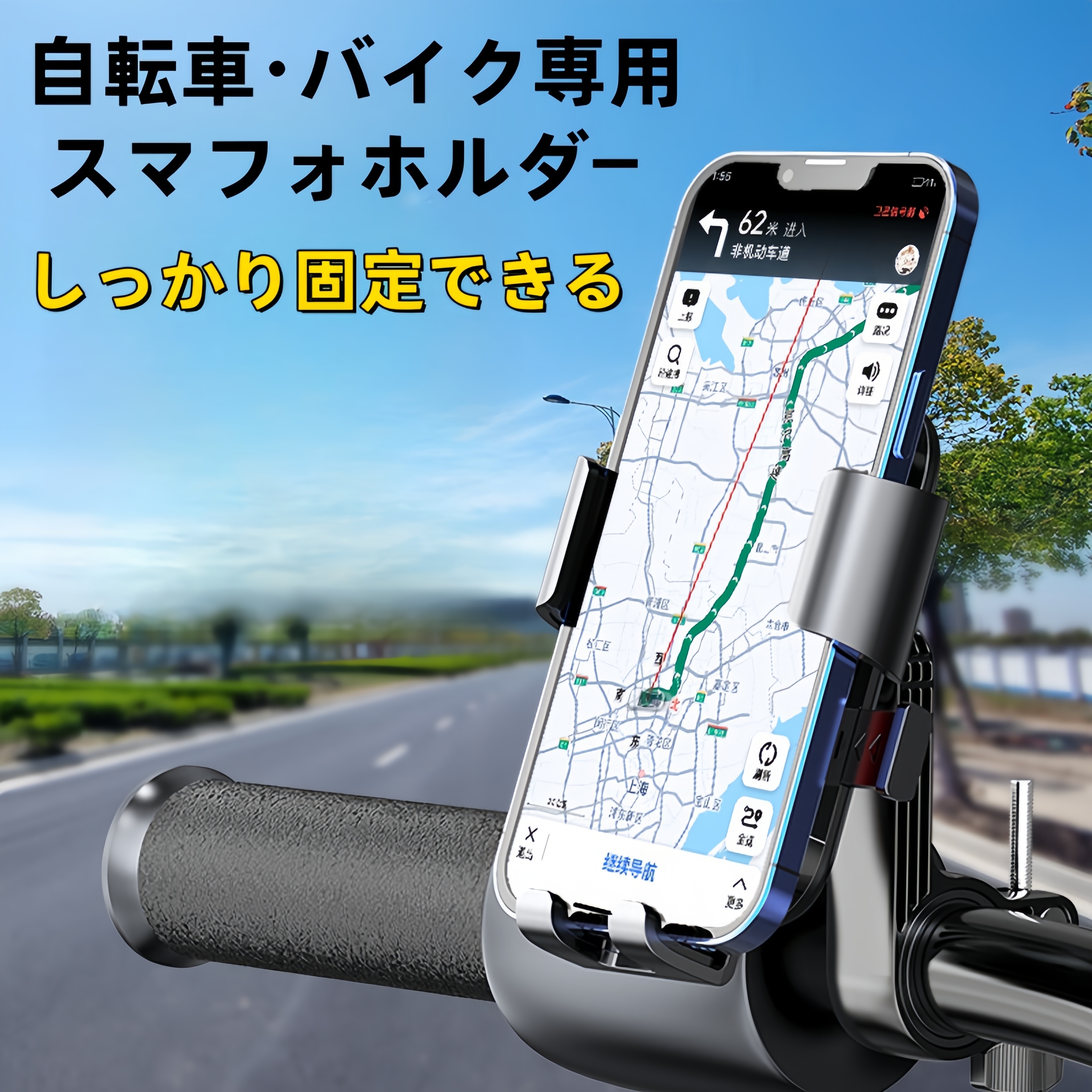 360度自由に向きが変えられ、上下左右の微妙な角度調節もできます。・主な材質:ABSゴムEVA・対応機種:4.5〜7 インチ&厚さ 12 mm、幅95mm以下のスマホに対応【安定構造】スマホがしっかり固定でき、激しい振動でも携帯が落ちません。落下率はゼロで、様々な道路状況に適し、非常に頑丈です。自転車、マウンテンバイク、ベピーカーやショッピングカートなどで用いられた、自転車用スマホホルダーです。