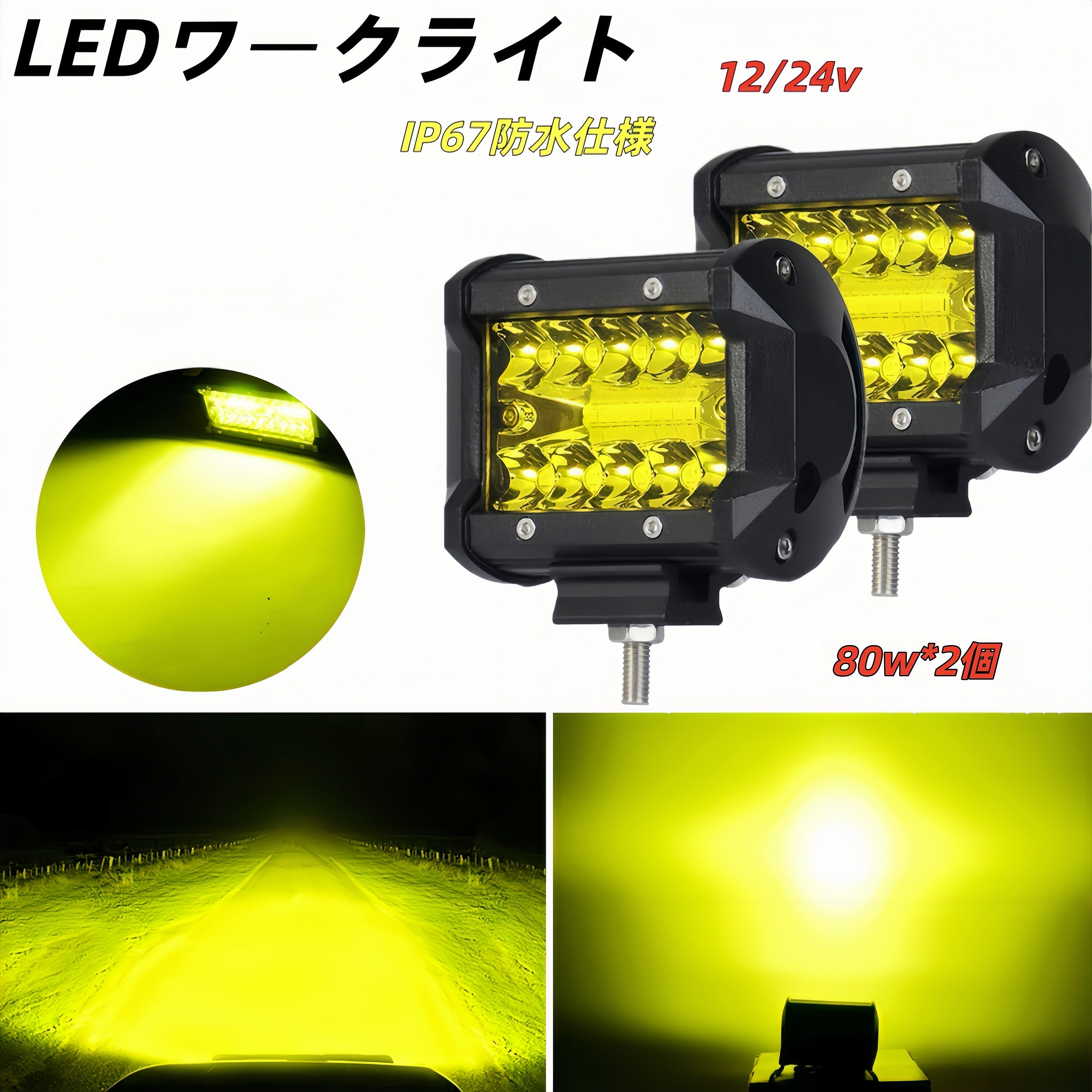 12V 24V ワークライト led 作業灯 フォグランプ ダンプ トラック スポットライト 投光器 80w 2個 黄 イエロー 補助灯 車幅灯