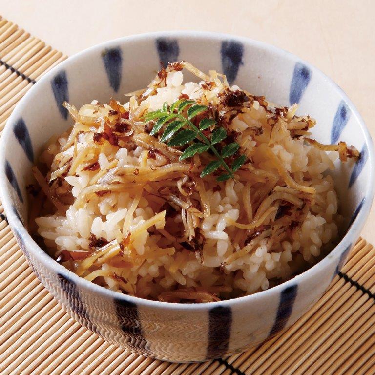 高知県産生姜の千切りを、小豆島で作られた本醸造醤油と枕崎産のかつお節で炊き込みごはんの素に仕上げました。素朴な味付けに生姜の風味がよく合います。