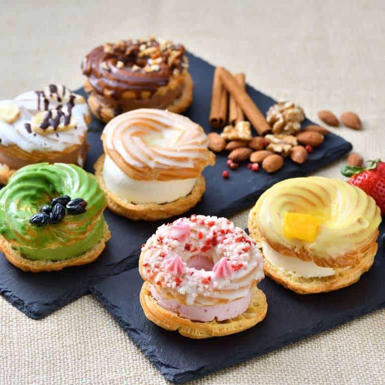 話題のシュークリーム専門店からパリブレストタイプのシューアイスが新登場。可愛らしいドーナツ型のシュー生地に北海道産生乳を使った濃厚なアイスクリームをサンドしカラフルに飾りつけました。