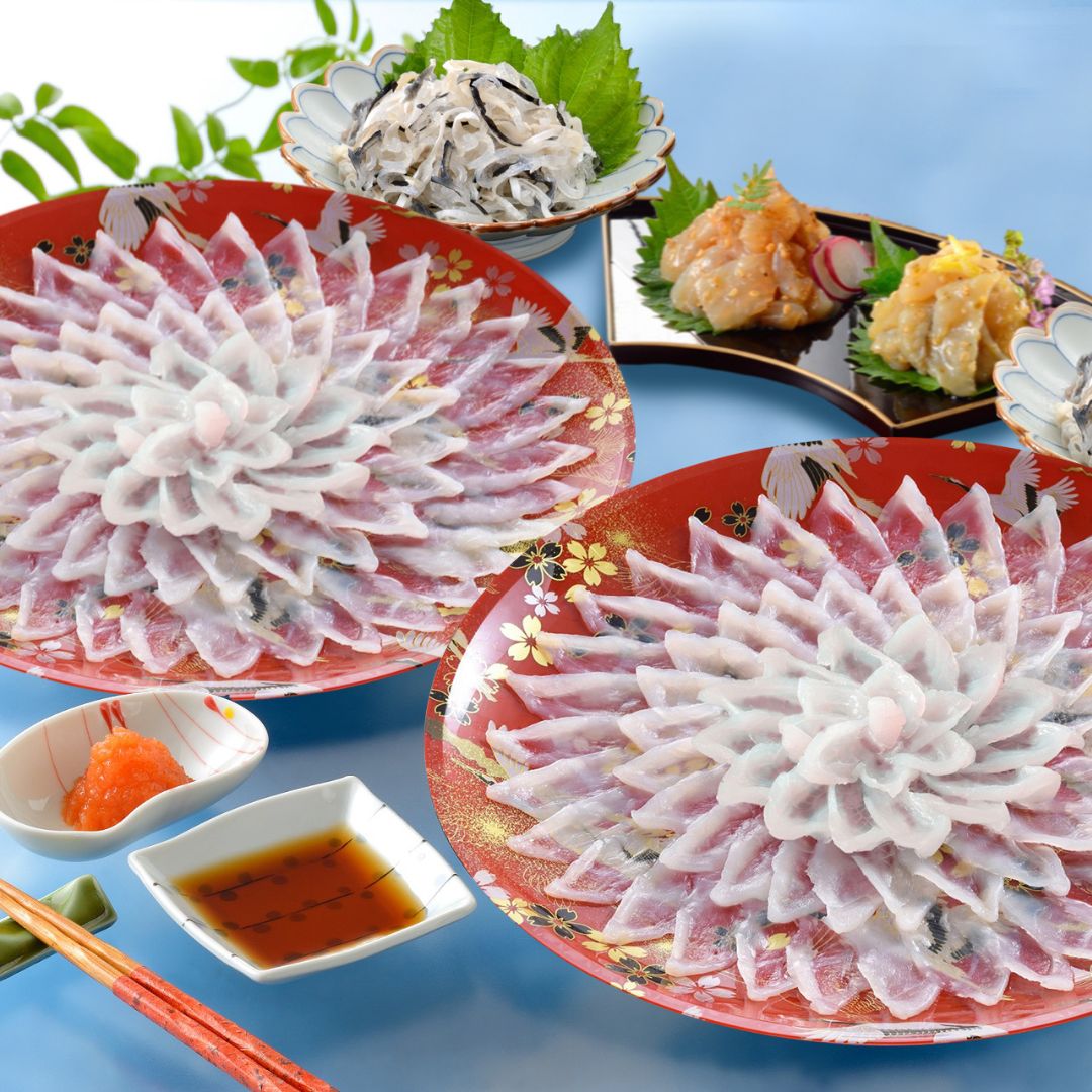 とらふぐ刺身(30cm皿)135g×2、とらふぐ皮30g×2、とらふぐ塩辛60g、とらふぐ塩辛(ゆず胡椒風味)60g、ふくポン酢180ml、もみじおろし10g×4